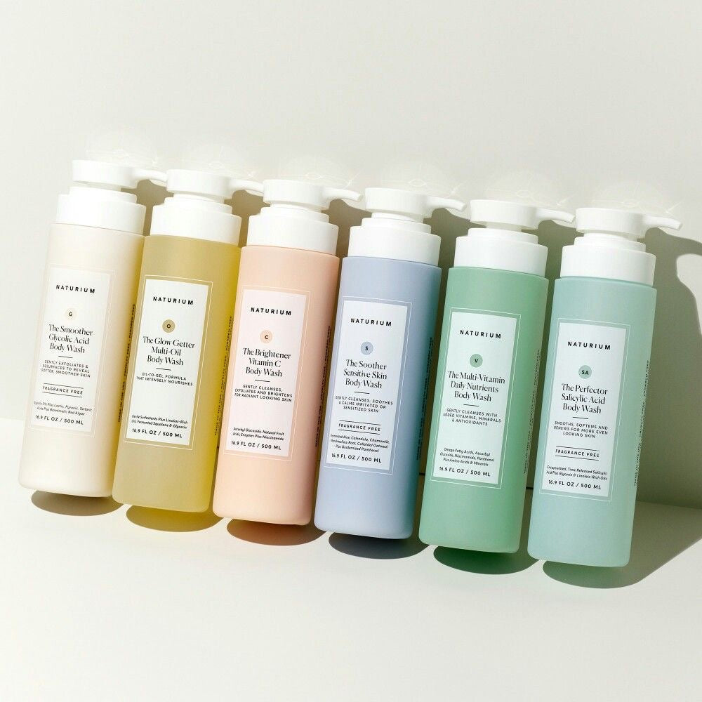 Naturium’s body washes are part of their “advanced body cleansers” line. They’re formulated with skincare-grade ingredients (e.g. salicylic acid, glycolic acid, vitamin C) to target common body skin concerns like uneven texture, clogged pores, dullness, and dryness.